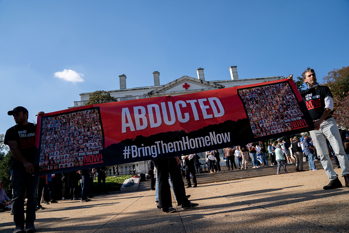 प्रदर्शनकारी 5 नवंबर, 2023 को वाशिंगटन, डीसी में रेड क्रॉस मुख्यालय के सामने बंधकों की रिहाई के लिए इकट्ठा हुए। प्रदर्शनकारियों ने हर रविवार को रेड क्रॉस के सामने इकट्ठा होने की योजना बनाई, जब तक कि अमेरिकियों सहित सभी इजरायली और विदेशी बंधकों को हटा नहीं दिया गया। हमास द्वारा रिहा किया गया, जिसने 7 अक्टूबर, 2023 को इज़राइल पर सुनियोजित हमलों के दौरान नागरिकों को बंदी बना लिया और गाजा में ले गया। | स्टेफ़नी रेनॉल्ड्स/एएफपी गेटी इमेजेज़ के माध्यम से